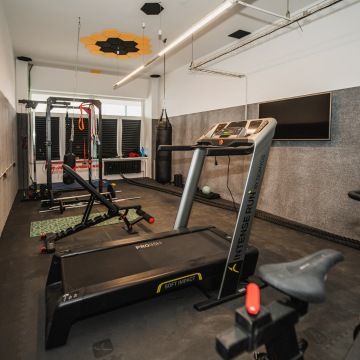 Součástí MaxOFF prostoru je i plně vybavená mini posilovna. Běžecký pás, hrazdy, stroj na benchpress, boxovací pytel, kolo i podložky na protažení. Všechno připraveno, kdybyste chtěli zapojit trochu pohybu.