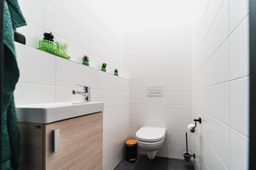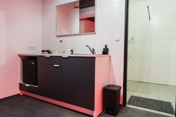 Koupelna nabízí dostatek prostoru, až pro 4 osoby. V tomto elegantně zařízeném prostředí najdete vše potřebné pro relaxaci a osvěžení.